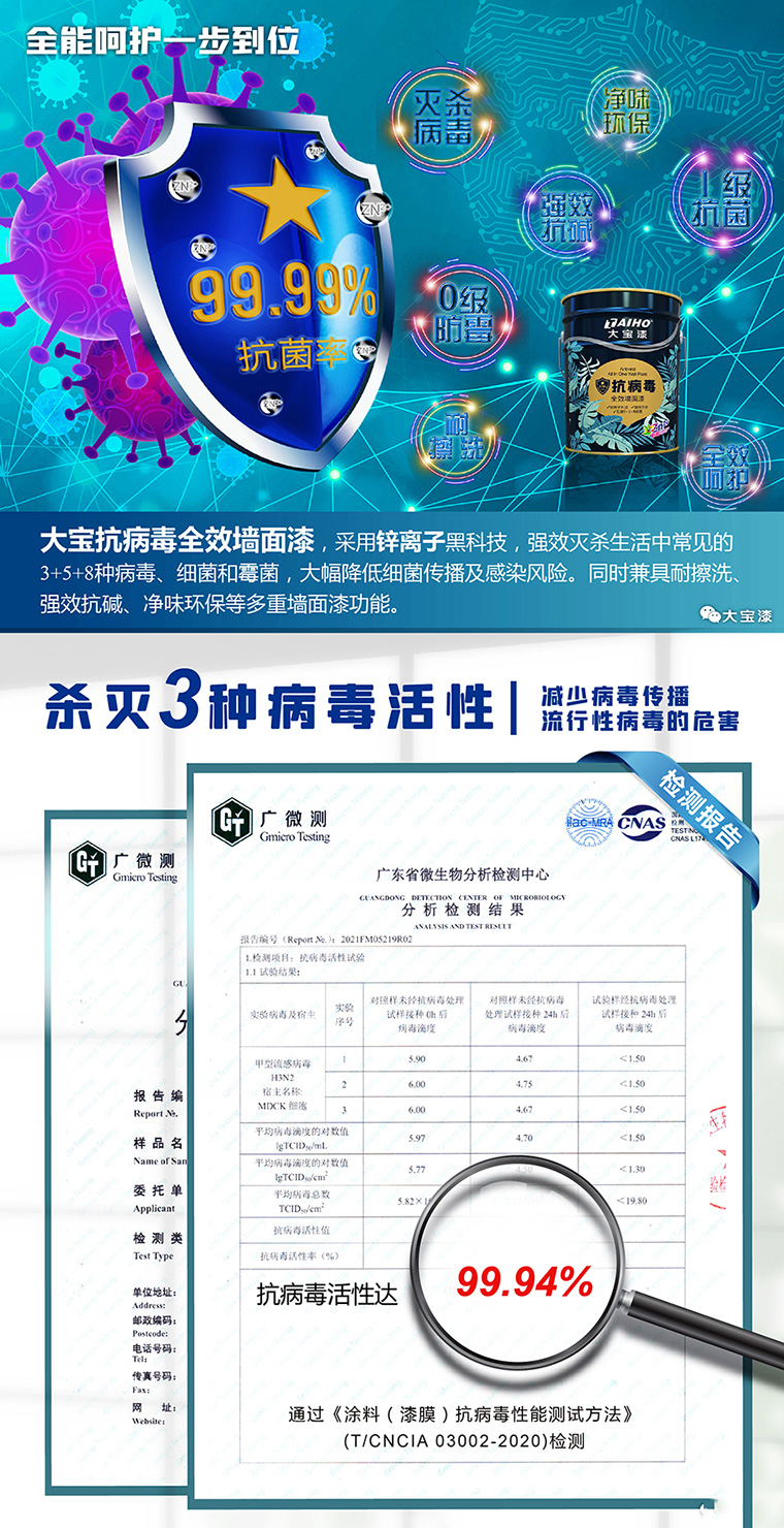因應日趨嚴峻的疫情,大寶抗病毒全效墻面漆的誕生猶如一場及時雨,給予我們實質(zhì)上的安全感,全方位締造健康安全的居室空間。