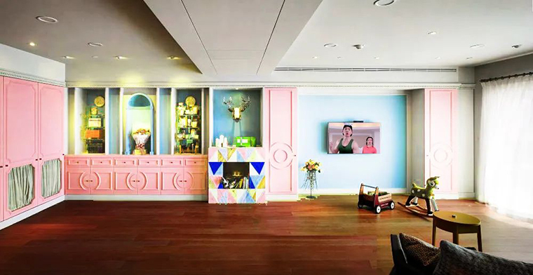 甜美的粉色櫥柜與相鄰的明亮藍色電視背景墻形成了美妙的色彩沖突,這是一個年輕的色調搭配,也是一種情感色彩的組合,感覺就像一個快樂的擁抱,木地板被用于整個室內,建立額外的紋理感。
