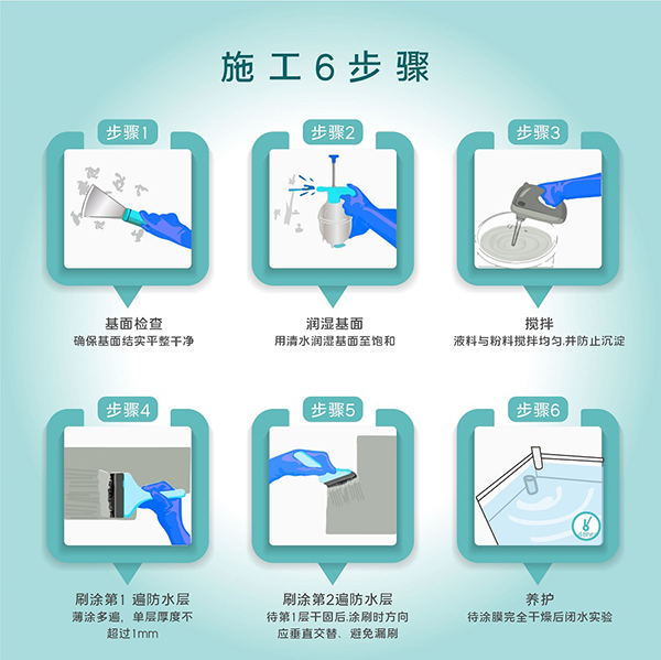 3.施工后保持通風,便于防水層干固;在潮濕環境中,可能會產生泛白和返堿現象。