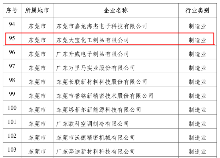 11月20日,第十八批廣東省省級企業(yè)技術(shù)中心名單于廣東省工業(yè)和信息化廳官網(wǎng)正式公布。其中,東莞大寶化工制品有限公司榜上有名。