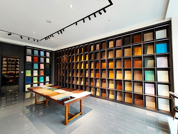 作為本次經(jīng)銷(xiāo)商大會(huì)的壓軸行程,與會(huì)嘉賓在午宴后前往山東大寶家具漆服務(wù)中心深度考察。步入展廳,極具現(xiàn)代感的色板陣列即刻映入眼簾—木器漆呈現(xiàn)天然肌理之美,金屬涂層閃耀科技光澤,塑膠與玻瓶的表面處理更突破傳統(tǒng)工藝邊界。