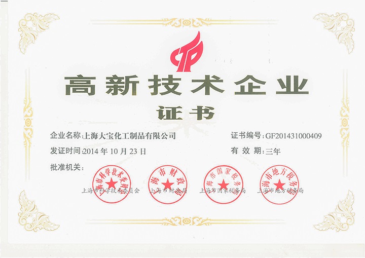 上海大寶在如此外在壓力下,捷報不斷。為了滿足大寶漆“精益求精,專業(yè)服務,致力創(chuàng)新,持續(xù)改善”的宗旨,上海大寶于2011年首次申請并通過了“上海市高新技術企業(yè)”,并于2017年10月成為上海市第一批公示的高新技術企業(yè),這是上海大寶繼2011年被認定為高新技術企業(yè)后第三次順利通過認定;2017年11月完成區(qū)企業(yè)技術中心復核工作;此外,也順利獲得“十環(huán)認證”證書。經(jīng)過上海大寶同仁的共同努力,在如此嚴苛的大環(huán)境條件下,上海大寶在2017年才能交出如此亮麗的成績。