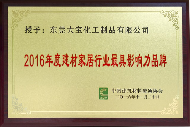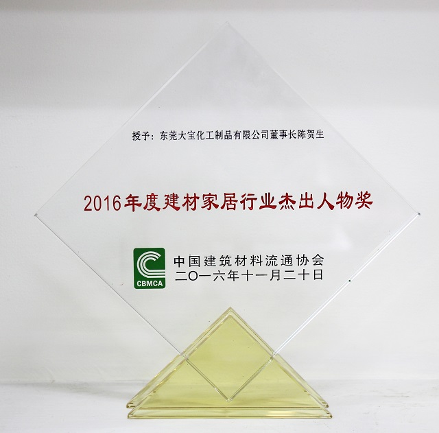 鑒于在二十多年的發展中所取得的成績,以及對中國建材家居所做的貢獻,東莞大寶化工被授予“2016年度建材家居行業最具影響力品牌”獎,同時大寶國際董事長陳賀生獲“2016年度建材家居行業杰出人物”獎。